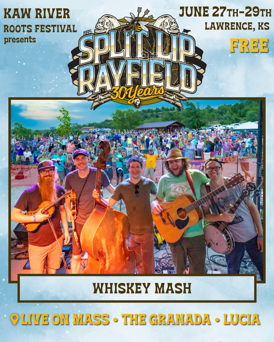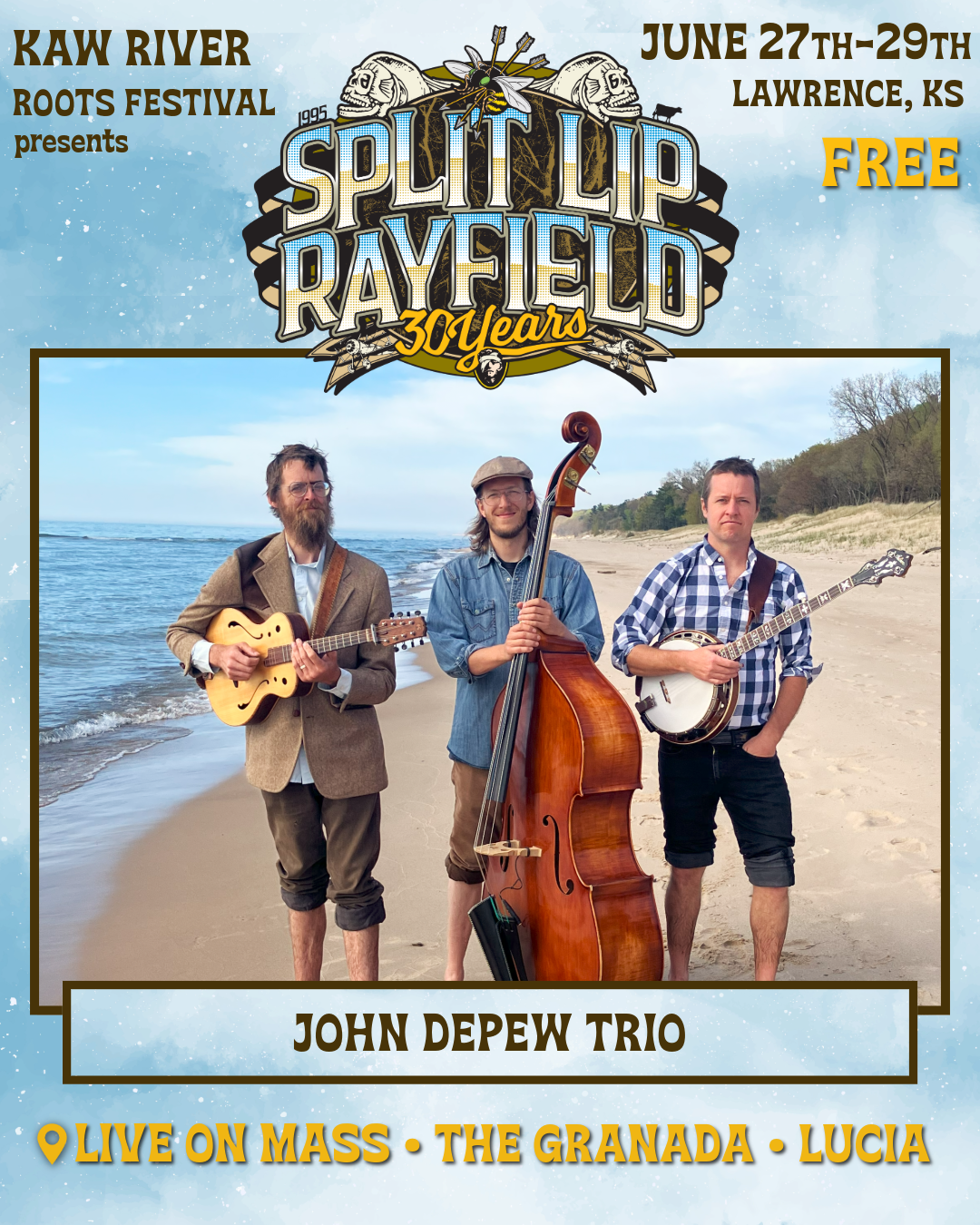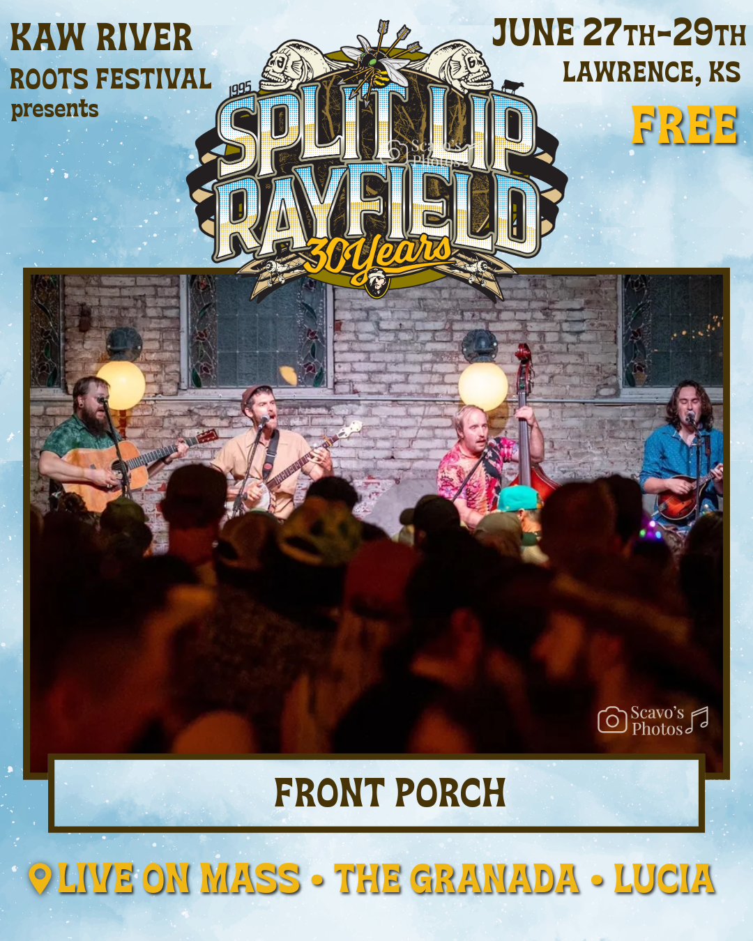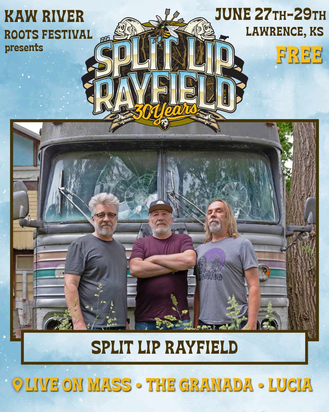 The Kings of Kansas Bluegrass, Split Lip Rayfield, will be celebrating their 30th anniversary with a free show live on Mass St at this year’s festival on Saturday night. Self-described as a “thrashgrass trio”, few acts have ever left a mark on the Kansas music scene such as this one. The group is credited with helping to shape a new genre by blending elements of bluegrass, punk rock, hard rock, and country music into a unique and powerful sound. The band’s iconic homemade gas tank bass, respectfully referred to as “The Stitchgiver”, is crafted from an automotive gas tank and fitted with a single weed eater line for the string. The band was formed after the Wichita and Lawrence musicians met in the Pecan Grove campground at the Walnut Valley Festival in Winfield, KS. SLR consists of Jeff Eaton (gas tank bass), Wayne Gottstine (mandolin, guitar), and Eric Mardis (banjo, guitar). They lost their charismatic guitarist and co- founder Kirk Rundstrom to cancer in 2007. The seemingly sparse combo is capable of producing a massive amount of sound. Audiences are amazed by the instrumental prowess and strong vocal harmonies on display at an SLR performance. All hail the Kings, Split Lip Rayfield.