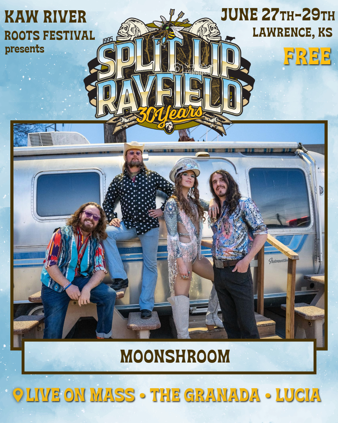 The group, hailing from Lawrence Kansas, performs captivating sets on stages far & wide. Featuring Lily B Moonflower on guitar & vocals, Jake Keegan on dobro & vocals, Zach Bozeman on upright bass, & Colby Allen Walter on mandolin, electric guitar & vocals. Together they create a unique sonic tapestry, building a bridge the audience can cross to feel a oneness with the musical energy radiating from the stage! Expanding upon stylings of Americana, bluegrass, folk, and country — the group sends their sound into the stratosphere with their signature spin of “Grassadelic Twang”. MoonShroom celebrates their new album release party with us as headliners on The Granada Theater stage Friday night.