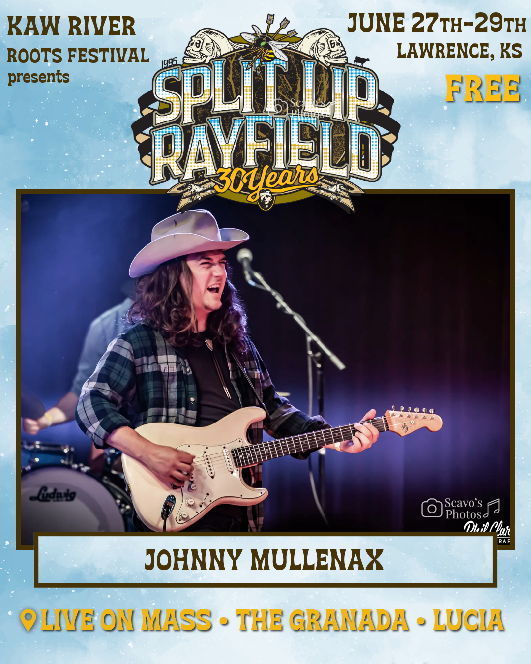 Funky Country Bluegrass Good Time For Working Folks. Johnny Mullenax and hisband are a musical juggernaut. Navigating genres between bluegrass, country, andfunky R&B with pristine professionalism and a new take on that distinctive Okie sound. Let Johnny and the boys rip your head apart post SLR with a late-night set at the Granada Theater on Saturday night. Then get your biscuits buttered by them as theyhost their signature Bluegrass Breakfast on Sunday at Lucia.